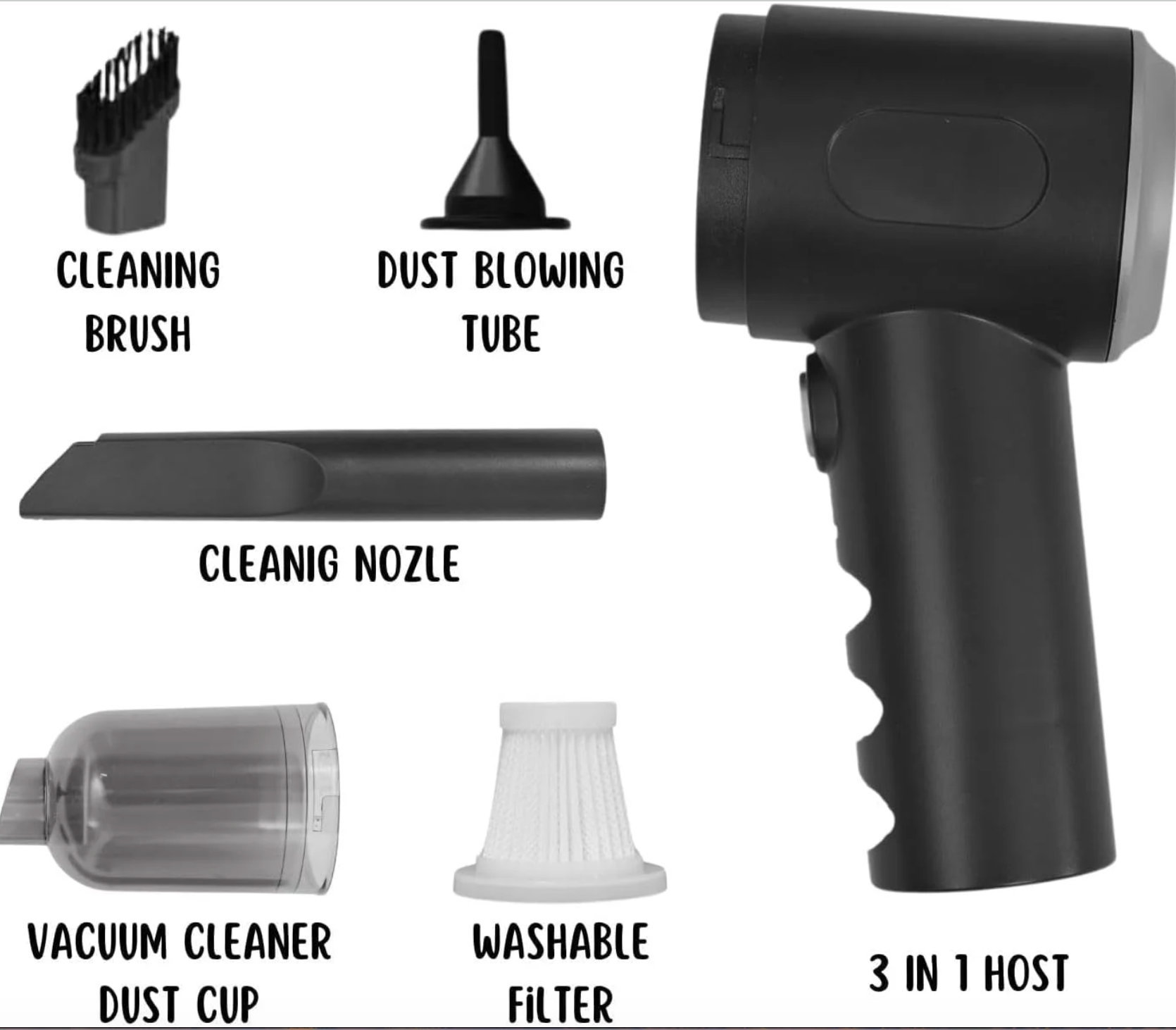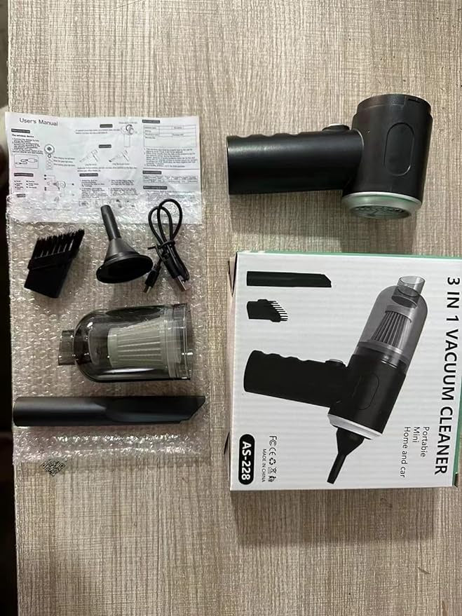 المكونات المتضمنة – كابل شحن USB، دليل المنتج، فوهة فرشاة إضافية، مكنسة كهربائية.